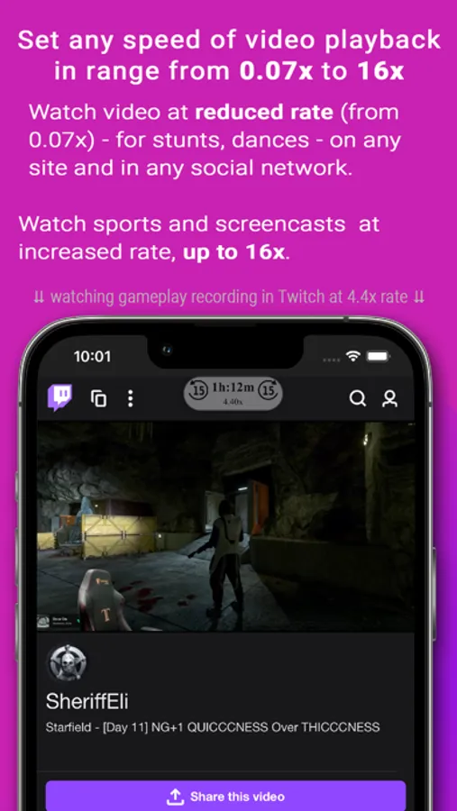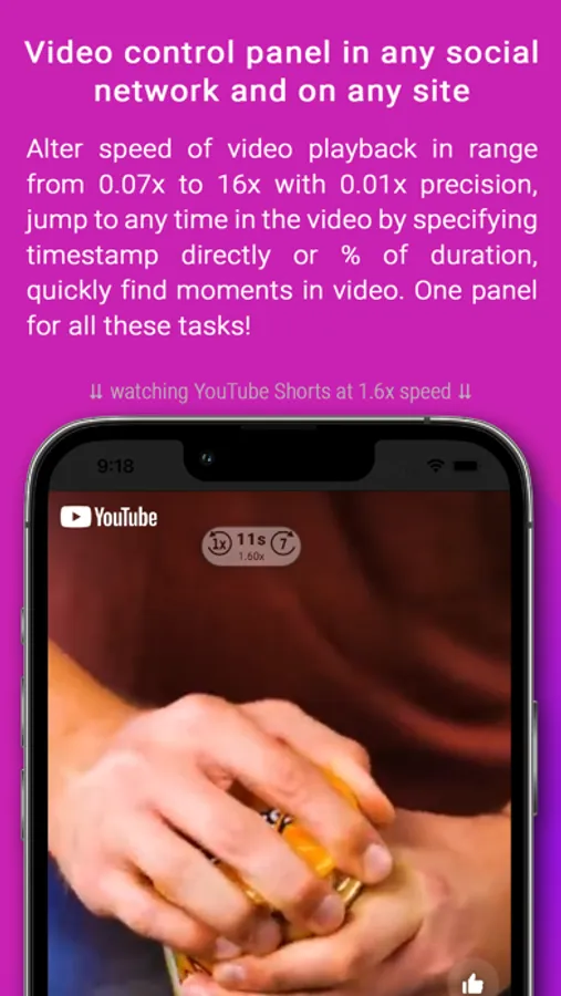 It shows video control bar, allowing you to use any playback speed besides common 1.25х / 1.5х / 1.75x and 2х, and it allows to quickly navigate inside the video with a couple of taps. All this available - in popular social networks and on any site.