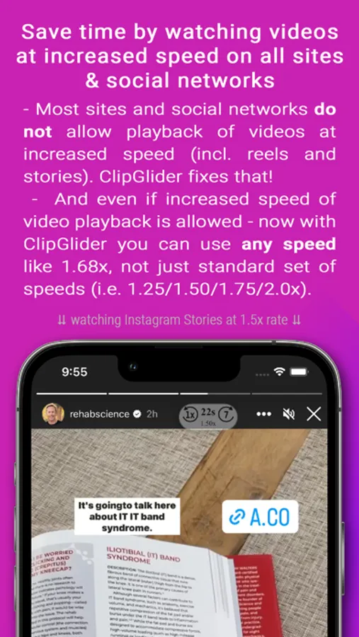 Watch stories in Instagram and Facebook, clips in TikTok, Likee and VK, and video in posts in any social media at increased speed, saving time, with ability to quickly switch to 1x speed in one tap. Watch 2 times more video by spending same amount of time you do currently, at 2x speed.