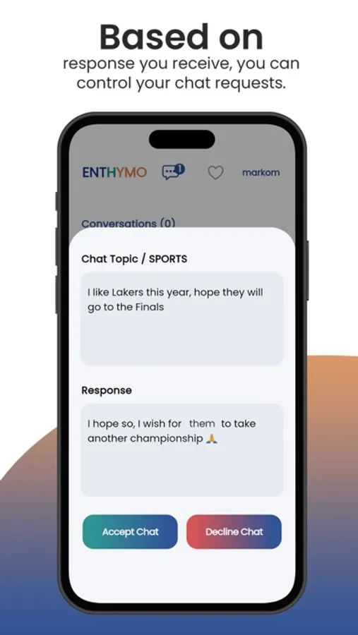 If other users find your topic of similar interests, they can respond to your post and send you a conversation request. Our goal is to make these responses interesting, funny, smart, or catchy, so you can meet new people and make new friends. Once you receive some responses, you can choose to accept or decline the request and start chat with people of similar interests.