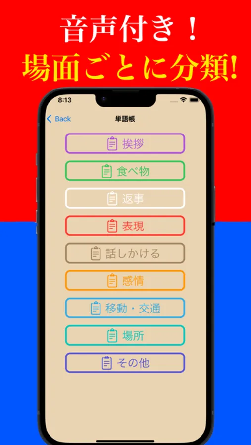 単語帳は発音付きで175単語を収録していて使う場面ごとに分けています。