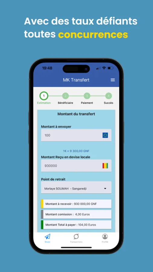 MKtransfert votre solution de transfert d'argent avec des taux de change défiants toutes concurrences. Prenez soins de vos proches en Guinée avec MKtransfert en profitant des tarifs les plus compétitifs du marché. Avec MKtransfert, vous avez le choix de retirer votre argent en Francs Guinéens ou en devise étrangère. Toutes nos commissions sont claires sans frais cachés.