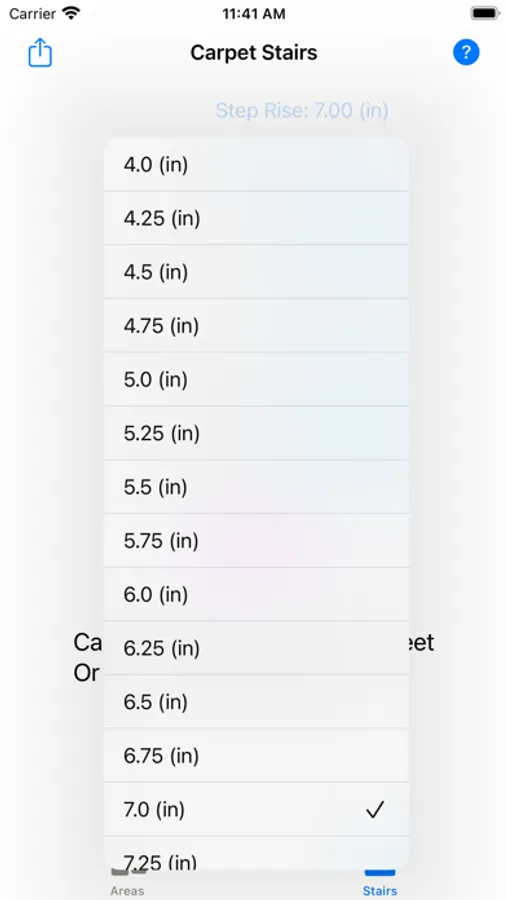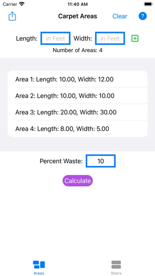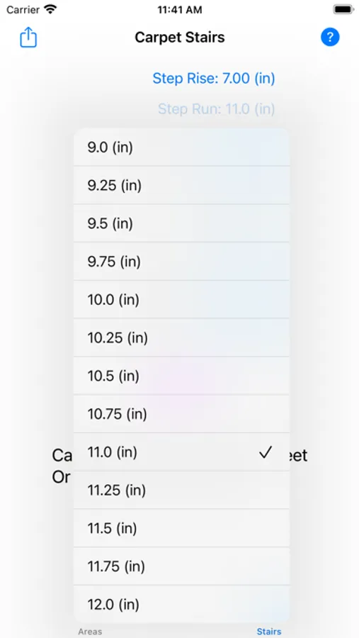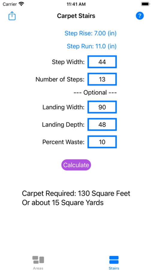 Also with a few quick entries displays the amount of new carpeting needed to cover stairs.