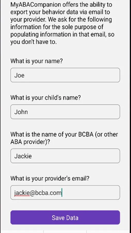 MyABACompanion allows you to quickly and easily store data, view data over time, and includes a 1-tap-export to your provider in the form of an email.