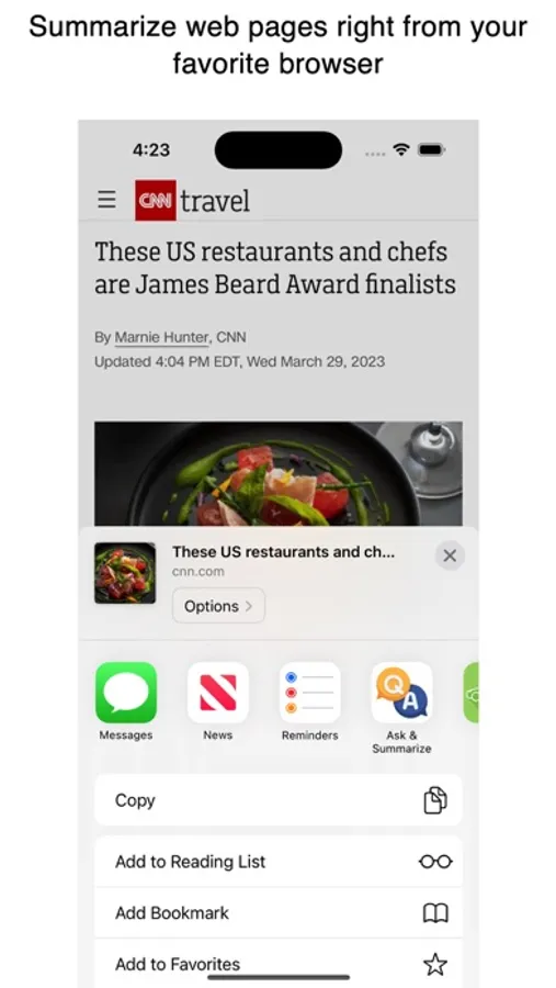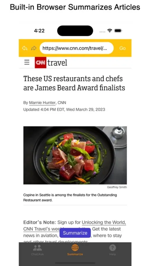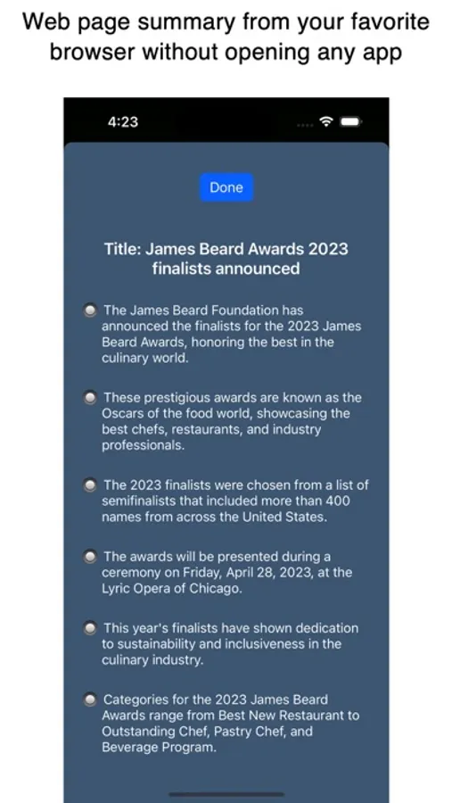 - Article summarization can be done either within the app or by tapping the share button in your favorite web browser and selecting the app icon (more instruction inside the app)
