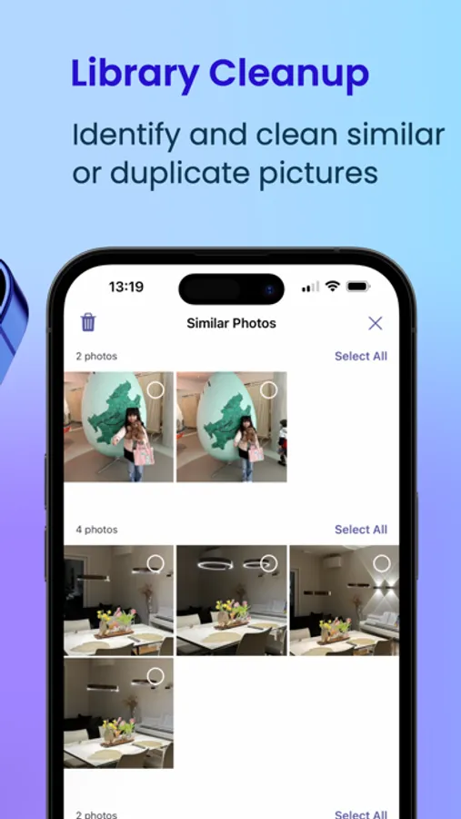 Cleanup your device Photo Library. Delete easily similar photos and free up your device storage. The app is using artificial intelligence and computer vision algorithm to identify the difference/similarity between photos..