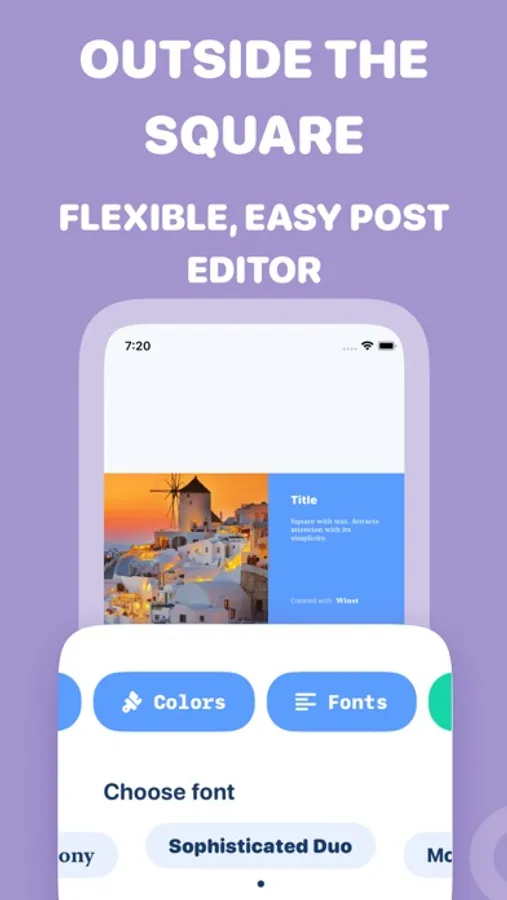 You will have access to over 20 font combinations and more than 40 color palettes. Join us and turn your Insta into a work of art with our photo and text editing tools!