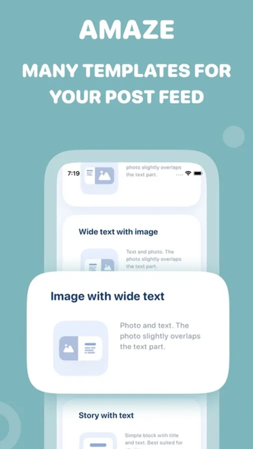 Enjoy the variable width effect that adds a twist to your photos, as well as the ability to overlay a photo on a text block or a text block on a photo to create truly unique images. With our pre-prepared color combinations and font pairings, you can be confident that your posts always look professional and stylish. We offer all the basic templates you may need, all at a low subscription price. Join us and turn your Insta into a work of art!