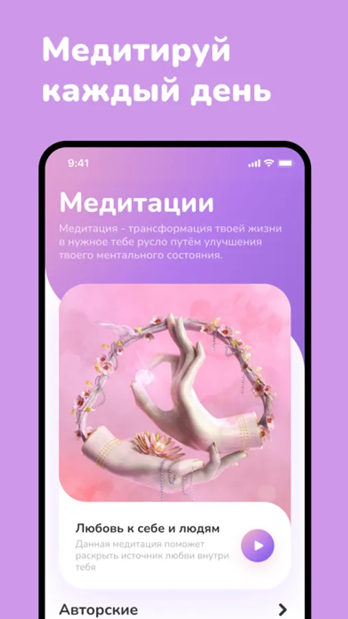 Слушайте авторские медитации и мелодии: Исследуйте глубокий мир медитации и музыки, представленный в нашем приложении. У нас вы найдете богатый каталог авторских медитаций и музыкальных композиций, созданных опытными профессионалами, чтобы помочь вам расслабиться, снять стресс и повысить концентрацию.