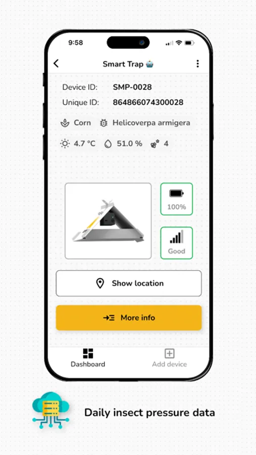 The app allows farmers to easily view real-time data on pest activity and receive alerts when thresholds are exceeded. By taking proactive measures based on this data, farmers can protect their crops and improve yields.
