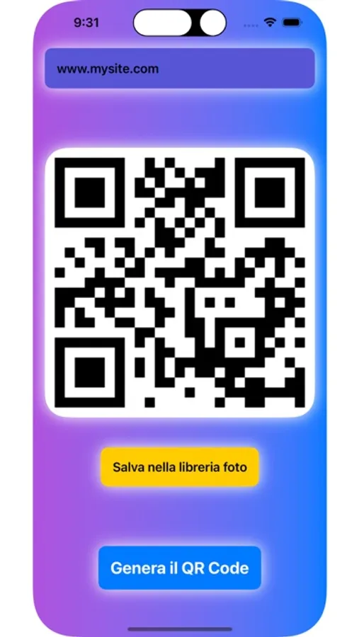 Scrivi il testo o incolla il LINK che vuoi convertire in un Codice QR e premi sul tasto "Genera il QR Code". Poi Salvalo nella tua Libreria Foto tramite l'apposito tasto.
