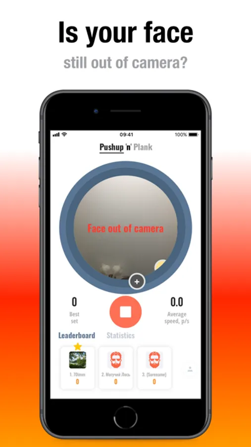 Only if the user's face is present in the camera frame, we allows to start training. Only if the user's face is in the camera frame the time counter is active and app count the time the user spent in the plank. Analyzing the variations of the apparent size of the user's face during push-ups as the user approaches and moves away from the camera, app can determine the upper position of the user's body, and push-up count is incremented.