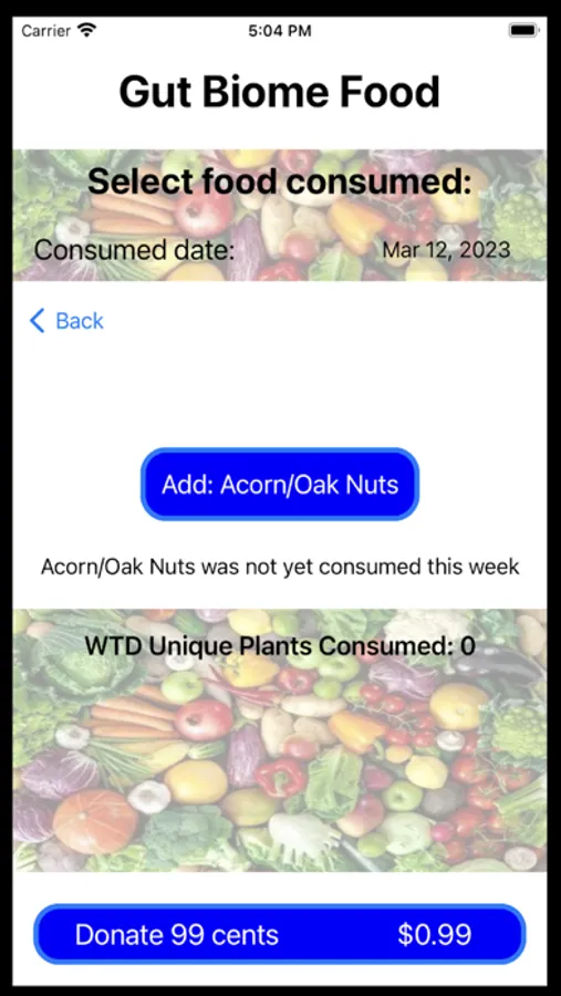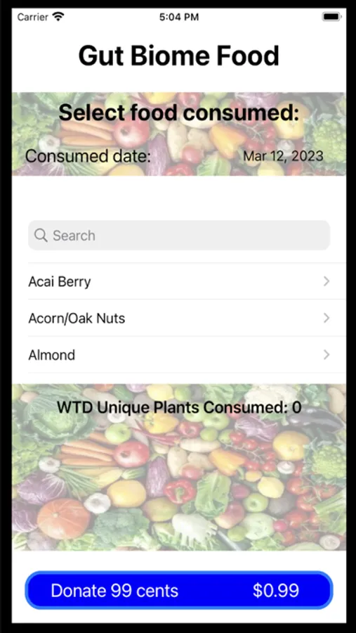Extensive list of plant foods. Easy input of what you consume. App will track WTD diversity for you.