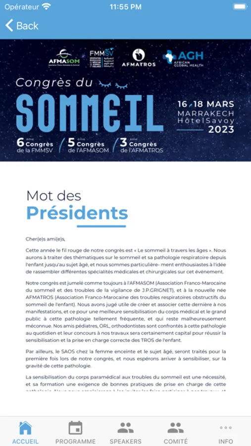 Cette année le fil rouge de notre congrès est « Le sommeil à travers les âges ». Nous aurons à traiter des thématiques sur le sommeil et sa pathologie respiratoire depuis l'enfant jusqu'au sujet âgé, et nous sommes particulière-ment enthousiastes à l'idée de rassembler différentes spécialités médicales et chirurgicales sur cet événement.