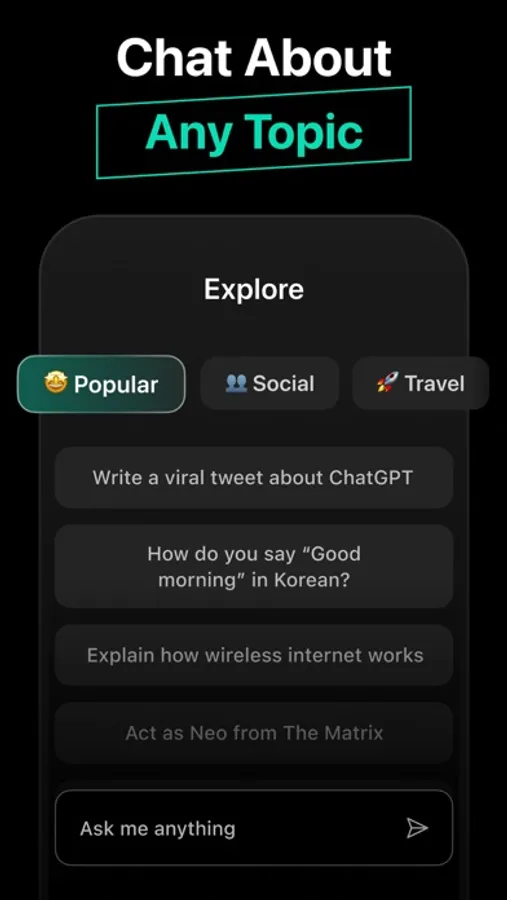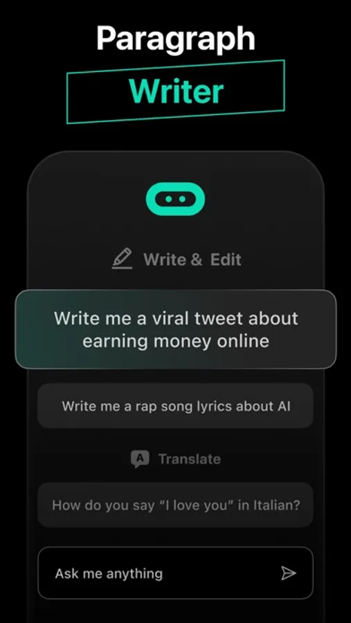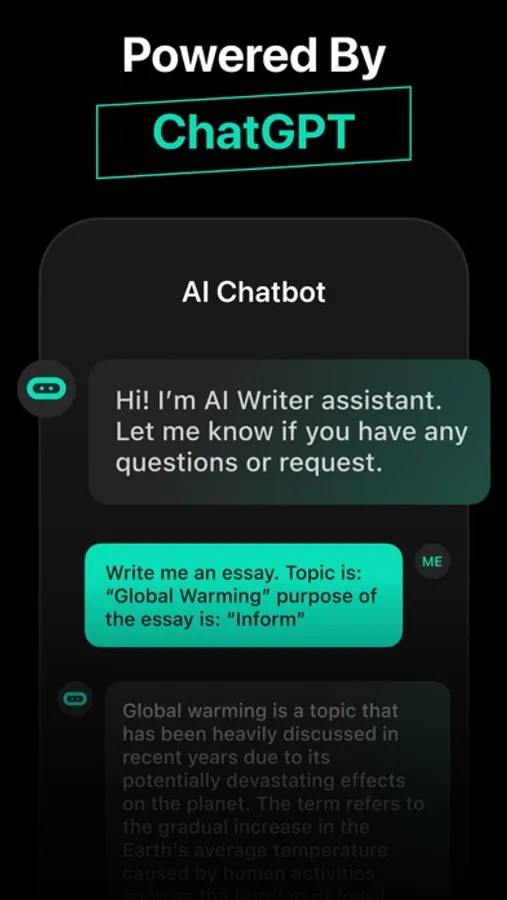 Our AI Chat model makes it easy to find answers for important questions and tasks. Whether you want to use it as an AI Essay Writer, good chatbot powered by AI, paragraph writer, the GPT powered AI chatbot, email generator, essay bot, script writing or AI Talk - AI Essay Writer will help you. You can get answers to any of your questions with Fast AI Chatbot. Write anything such as: essay, paragraph, email, tweet, song, poem, text and much more!