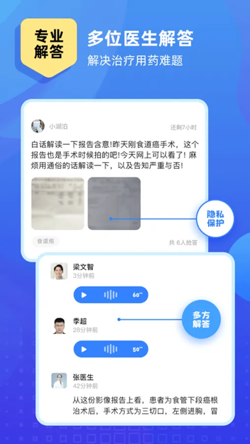 使用我们的应用程序非常简单,患者只需要上传他们的检测报告,应用程序会智能匹配医生解读,完成报告解读。此外,我们会确保患者的隐私得到充分的保护,所有的信息都会进行脱敏处理。