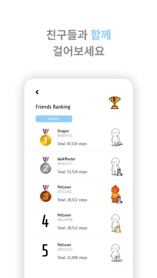 - 친구들과의 걸음수를 비교하여 주간 랭킹을 볼 수 있어요.