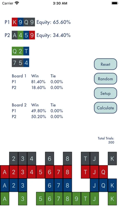 Practice your estimations by choosing random scenarios and guessing the equities. Input your own situations to evaluate and improve your play. No tool like this exists on the market so stay ahead of your competition by getting sharper at estimating your equity in various scenarios.