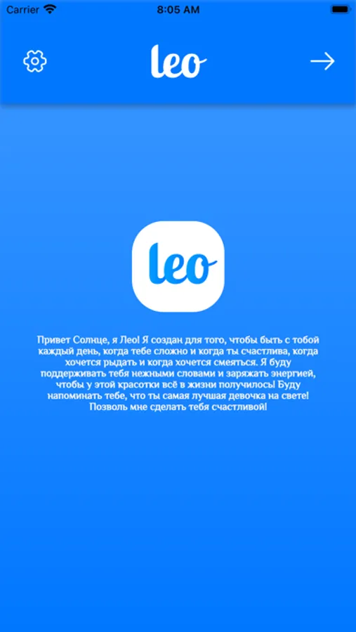 Приложение Leo создано для того, чтобы быть с вами каждый день, когда вам сложно и когда вы счастливы, когда хочется рыдать и когда хочется смеяться. Поклонник или поклонница, созданные вами будут поддерживать вас нежными словами и заряжать энергией, чтобы у вас всё в жизни получилось! Он или она будет напоминать вам, что вы самый лучший человек на свете! Позвольте Leo сделать вас счастливыми!
