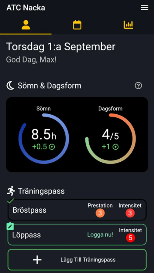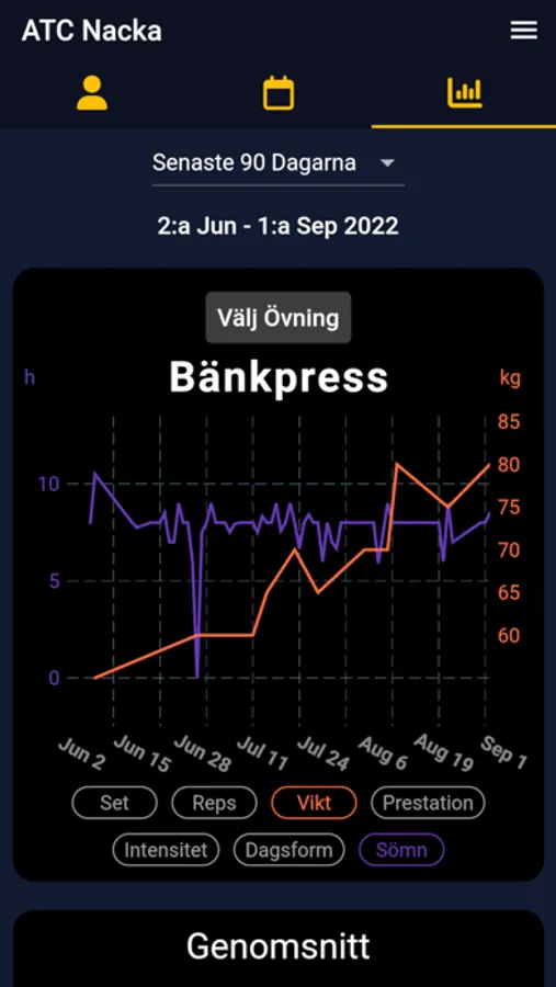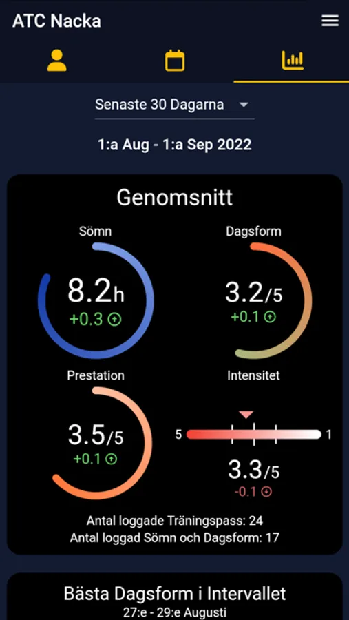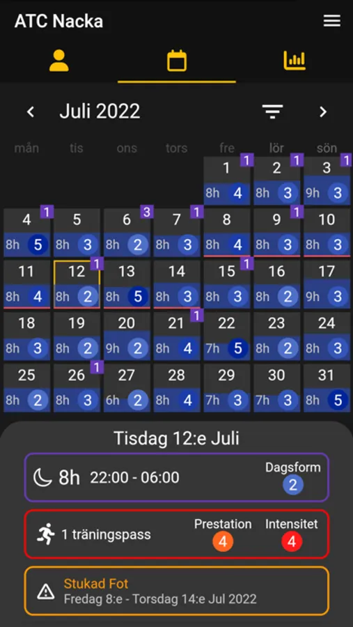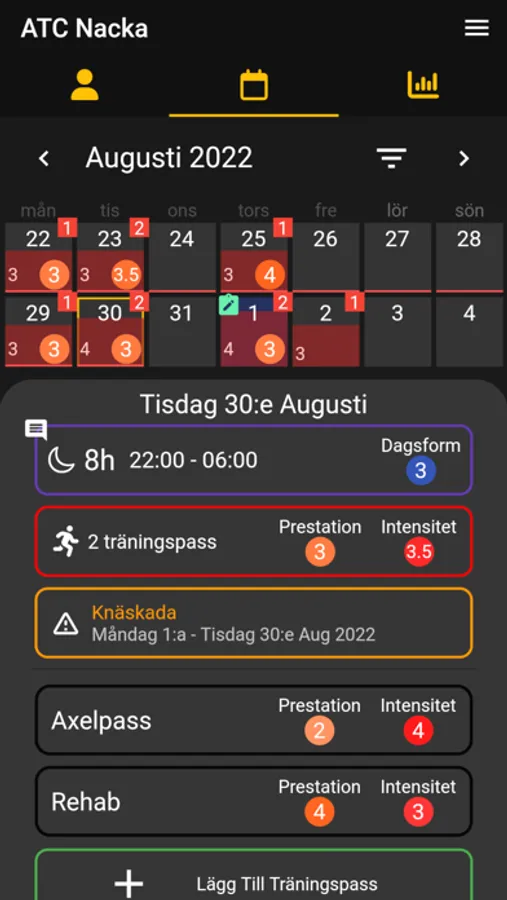 Appen är utvecklad med din utveckling i åtanke. I samband med PT på ATC Nacka är datan du loggar i appen en grund till att kunna förbättra din utveckling ytterligare. I appen kan du logga och planera dina träningspass samt logga sömn, skador och menstruation. Du kan även få en översikt över utvecklingen i din träning och välmående tillsammans med andra sammanfattningar av din data.