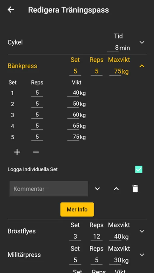 I appen finns även en stor bank med olika övningar som du kan använda i dina träningspass, eller så kan du lägga in dina egna övningar. Du kan även spara dina träningspass som mallar för att snabbt kunna logga liknande pass i framtiden!