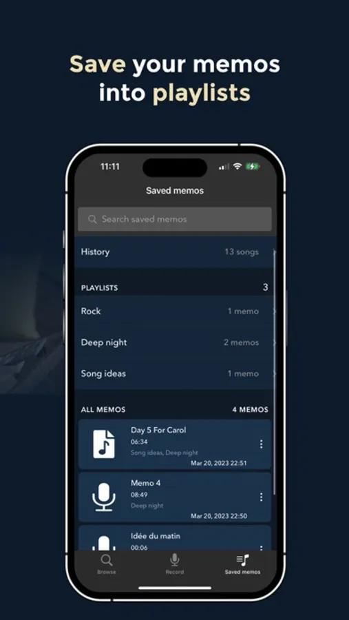 Music Memos vous permet de vous enregistrer et d'obtenir des accords, rythmes, paroles, pistes midi et bien plus encore grâce à des algorithmes IA avancés directement sur votre téléphone. Music Memos garde vos mémos en sécurité et synchronisés sur tous vos appareils. Vous ne perdrez plus jamais vos mélodies et idées de chansons!