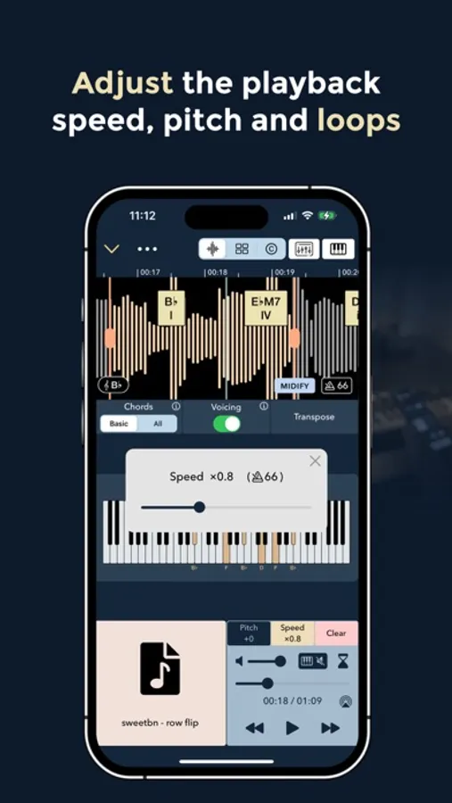 - Changement de vitesse: Ralentissez ou accélérez la lecture à votre guise pour pouvoir jouer facilement en même temps que la chanson.