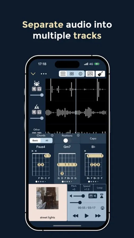 - Capo intelligent: vous pouvez également laisser Music Memos vous indiquer le capo préféré pour soit faciliter le jeu soit correspondre à la chanson [Version Pro].
