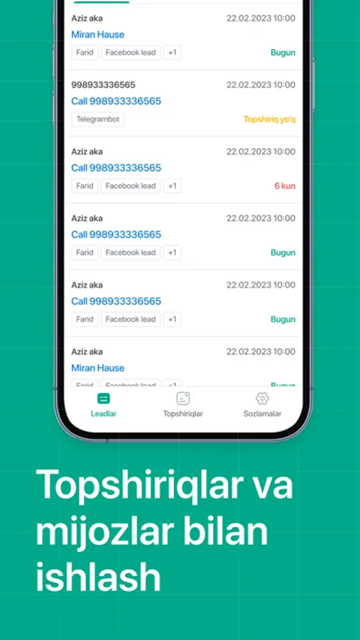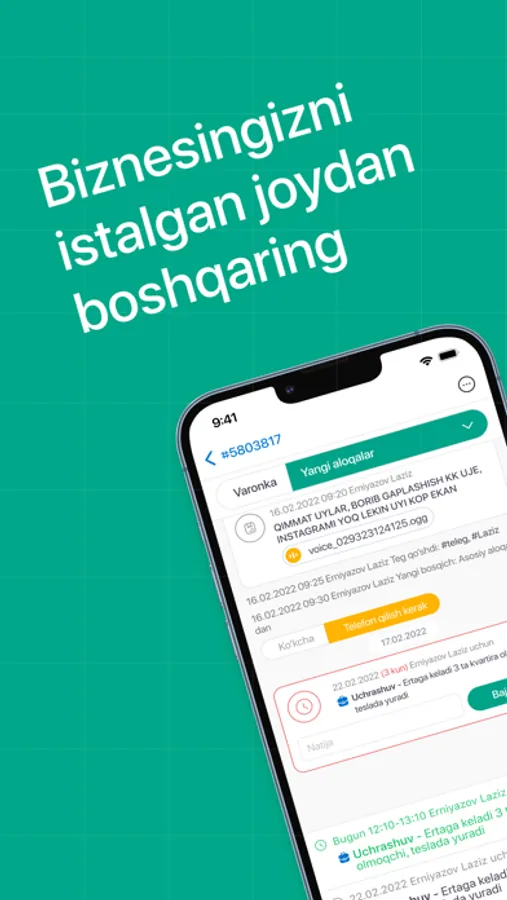 UYSOT CRM – dan foydalaning va potensial mijozlarni, savdo voronkaisini boshqaring, hamkasblar bilan o’zaro ma’lumotlar almashinuvini kuzating, topshiriq, vazifa eslatmalar yarating va biznesingizni rivojlantiring.