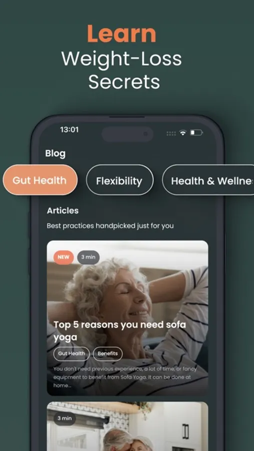 - Daily Personalised Workouts: Get your custom Sofa Yoga workout that’s designed for your fitness goals – be it back pain relief, weight loss, or stretching.
