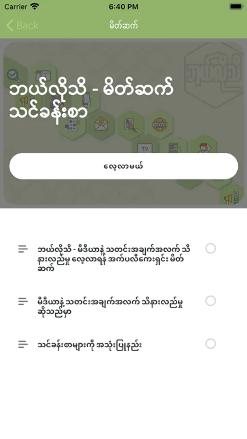 This application is developed with the aim to educate young adult users in Myanmar with media and information literacy (MIL) training. The course contains five modules covering,