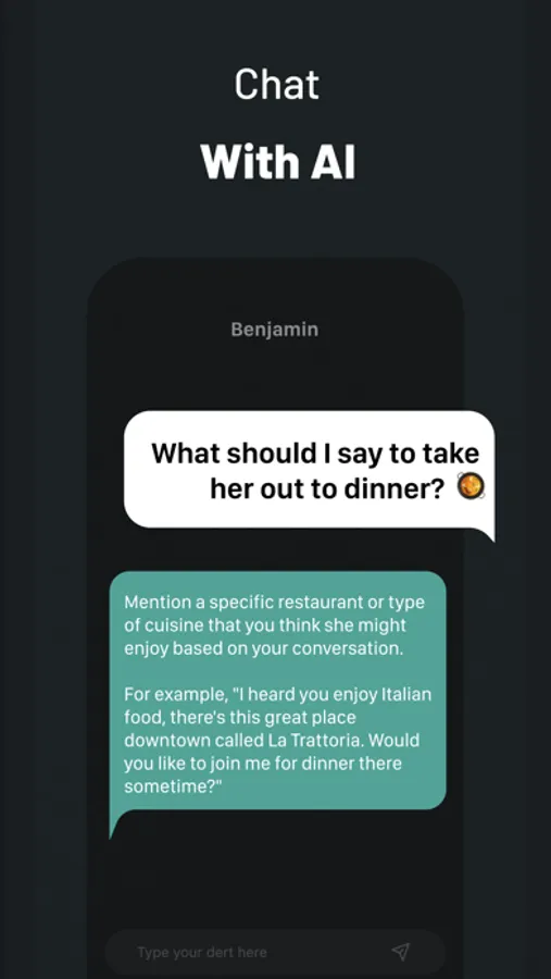 Introducing Benjamin, your very own AI dating coach powered by ChatGPT free! Whether you're new to dating or simply looking to up your game, Benjamin, the chatbot based on Chat GPT AI, is here to guide you through the complex world of modern dating.
