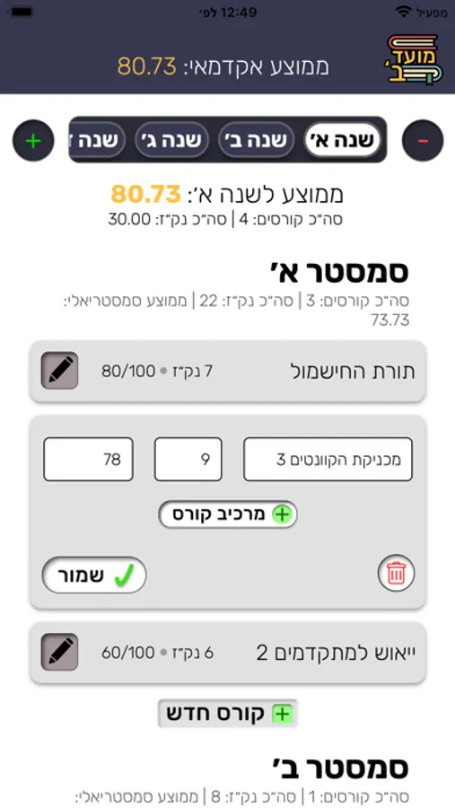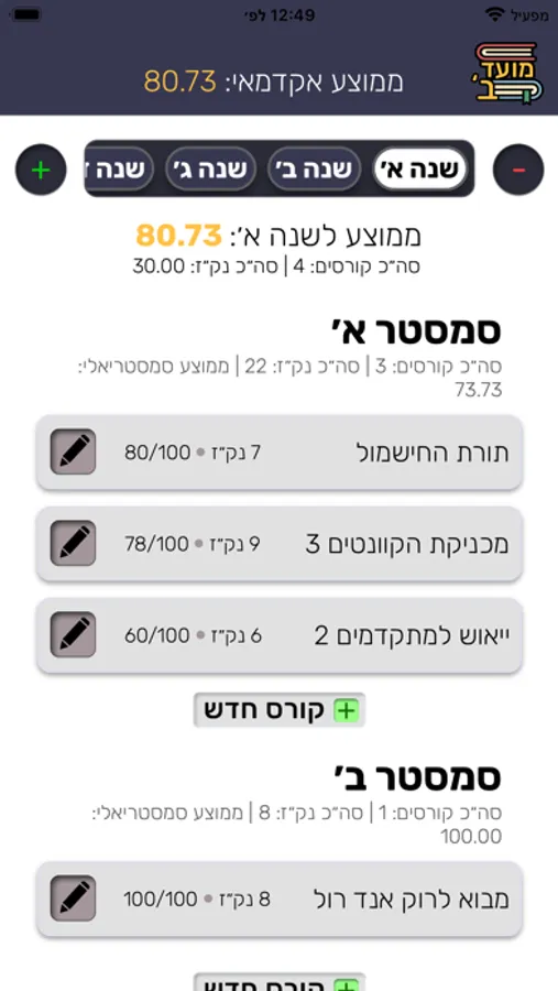 מחשבון ציונים לסטודנט למעקב אחרי ממוצע הציונים בכל סמסטר ובכל שנה לפי נק״ז.