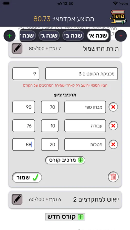 - ניתן לערוך כל פרט כגון שנים קודמות ,סמסטרים קודמים ומרכיבי ציון בלחיצת כפתור.