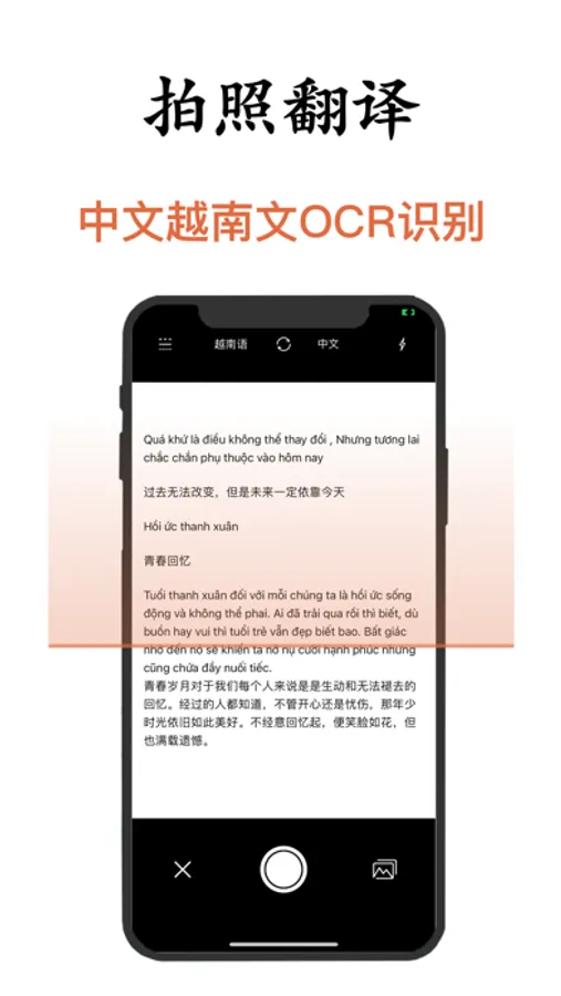 超级精准的ocr图片识别,支持手机拍照及相册中文与越南文照片,轻轻一按结果就显示,绝对是出行的必备工具。