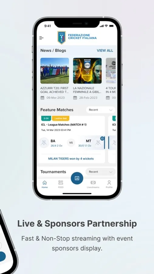 Italian Cricket Federation Cricket Match Scoring Application. Find out the results of the matches of the Leagues in Italy, rankings and averages of all players