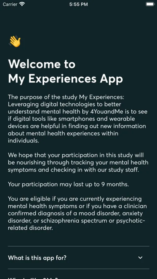 The purpose of the study My Experiences: Leveraging digital technologies to better understand mental health by 4YouandMe is to see if digital tools like smartphones and wearable devices are helpful in finding out new information about mental health experiences within individuals. This app uses HealthKit and motion data to assess your steps, walking/running distance and your overall activity.