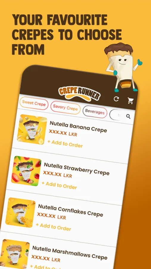 YOUR FAVOURITE CREPES TO CHOOSE FROM - You can easily scroll down our App and select your favorite Crepe, your favorite choice of topping, and extras from the menu in less time.
