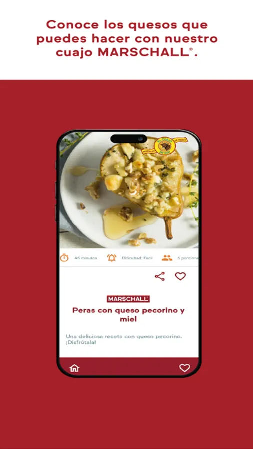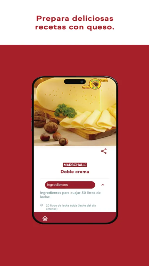 MARSCHALL® App is free. A mobile app in which you will learn about our brand's coagulant and you will have tips to learn how to make cheese with it. It will be easy and fun! You will also find information from our distributors and you will find the step by step to make recipes with cheese.
