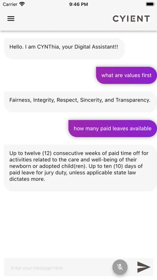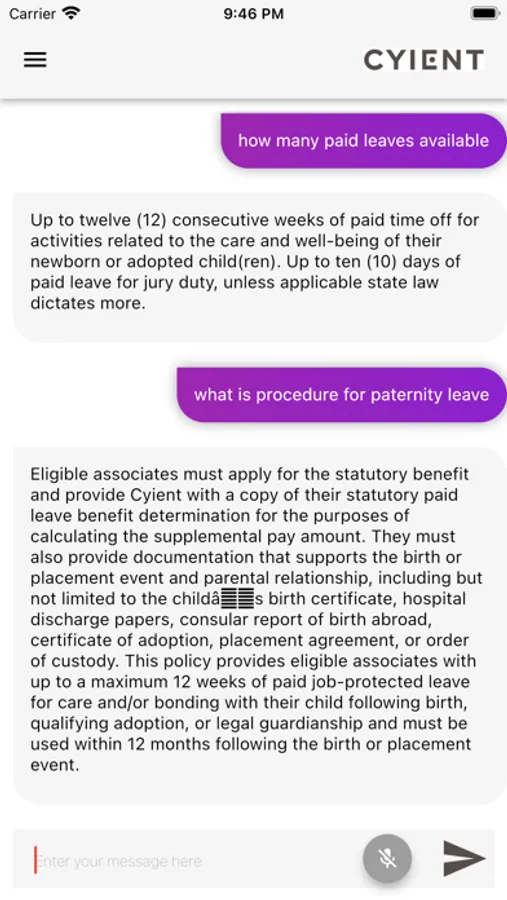 An AI-powered chatbot provides associates with easy access to information on company policies. The chatbot utilizes natural language processing to answer any questions associates may have regarding policies, ensuring that they have accurate and up-to-date information. The chatbot is available 24/7, allowing associates to receive immediate responses to their queries at any time. The more you interact with this AI chatbot, the more it learns and adapts.