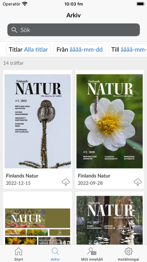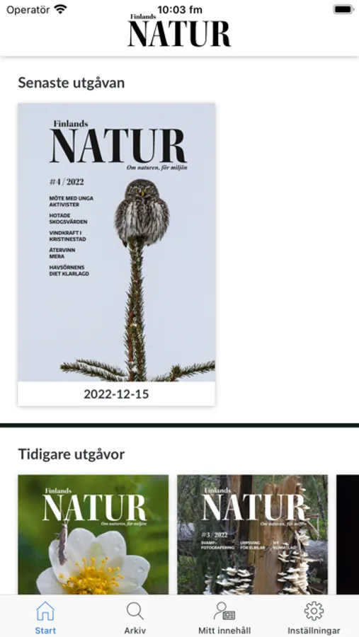Finlands Natur är den finlandssvenska naturtidningen som även innehåller massvis med information om aktuella miljöfrågor. Tidningen utkommer med fyra färgsprakande nummer om året. Medryckande naturskildringar gör dig inspirerad till egna naturupplevelser och praktiska tips om miljövänligt handlande motiverar dig till en hållbar livsstil. Finlands Natur erbjuder nu sina prenumeranter möjligheten att läsa tidningen på nätet. Med appen kan du enkelt läsa Finlands Natur i mobiltelefonen eller på en pekplatta.