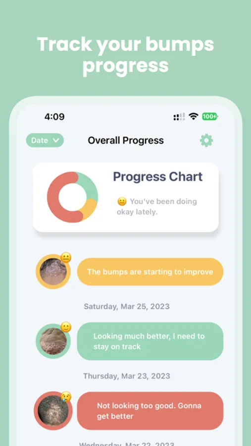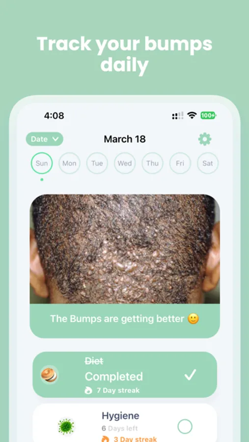 With our app, you can easily capture daily images of your bumps and check off your daily tasks to monitor your skin's progress over time. You'll be able to identify any problem areas that need more attention and see how your skin is improving.