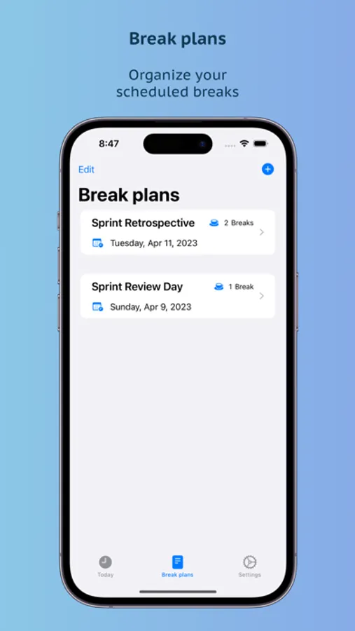 With the daily overview, you always know exactly which breaks are due for the current day. You will be notified about your planned breaks so you won’t forget them anymore.