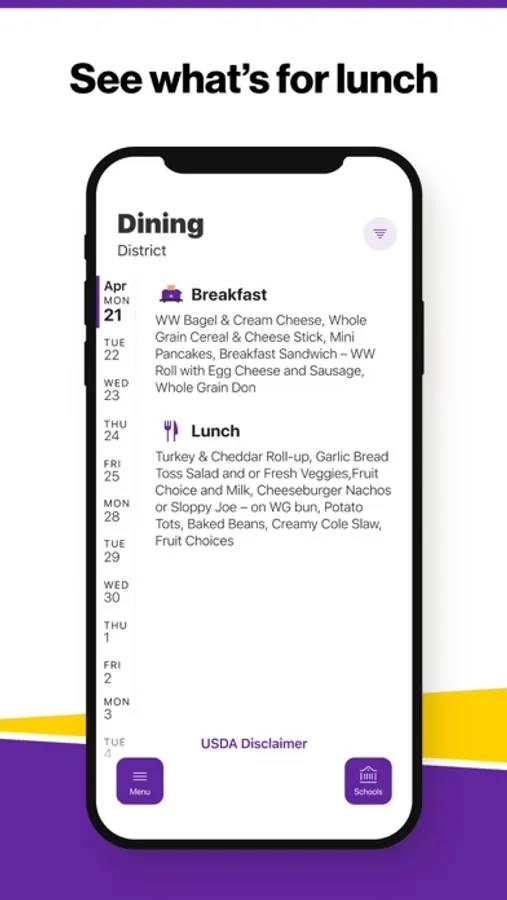 Within the dining section, you'll find an easy to navigate, weekly menu, sorted by day and meal type.