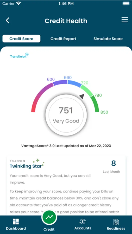 Your credit score is prominently displayed in your dashboard - and it doesn't cost you anything. Track changes month to month and learn the key factors that make up your score like length of credit, timely payment history, utilization of credit, total accounts opened and inquiries. Don't worry, this is a "soft credit pull" meaning there is no impact to your score by checking it. Look through your credit report for accuracy. Access helpful articles that explain credit bureaus, credit score, and more.