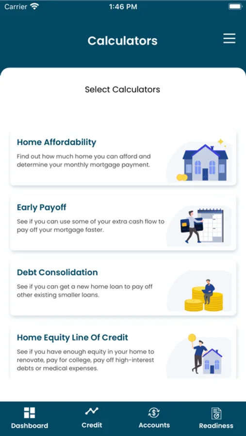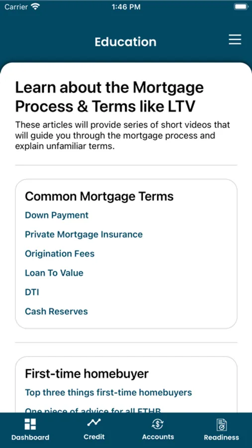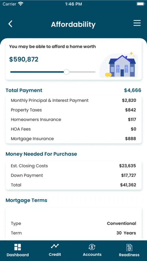 Work with What’s A Mortgage to best prepare you for home ownership by planning for a down payment, establishing reserves, managing your debt to income ratio, improving or maintaining your credit, loan scenarios through our calculators, establish your projected loan to value, and more. Visit the readiness assessment in your app to see a snapshot of your credit overview, debt to income ratio, cash reserves, employment, down payment and sales price.