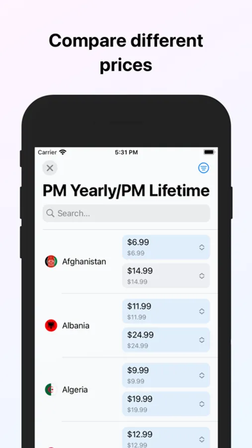 You can compare prices for different countries side by side. This makes it easy to see how prices vary across regions and make informed decisions about pricing strategies.