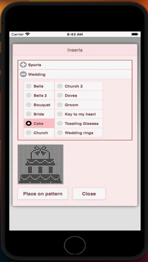 Inserts button - add filet crochet pattern inserts to your pattern (like roses)