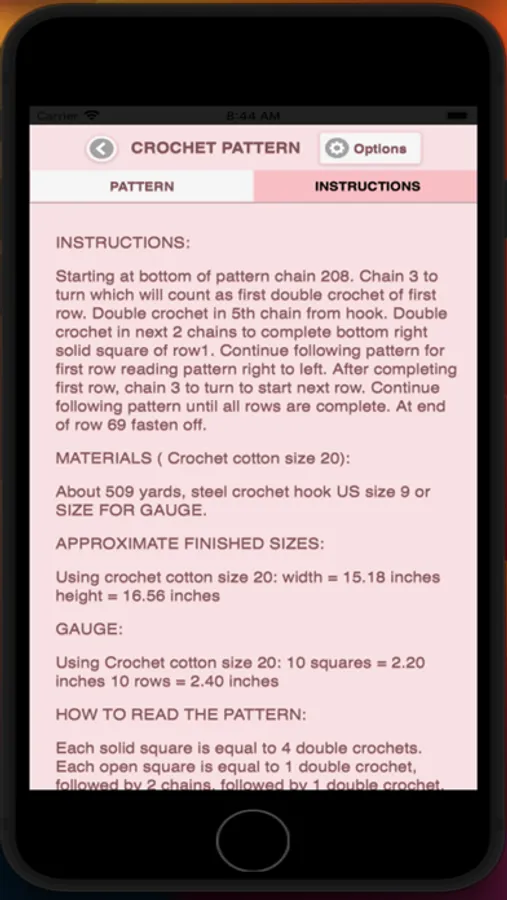 Written filet crochet instructions are automatically generated for your filet crochet patterns. Included are the amount of thread/yarn needed and approximate finished sizes for your filet crochet pattern.