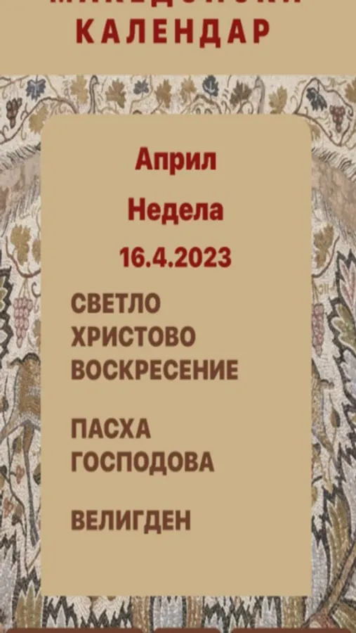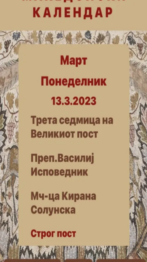 This is a calendar app which includes a full year calendar of feast days and saints according to the Orthodox Church calendar (Julian style). The application is on Macedonian and English language and its very simple and easy to use.