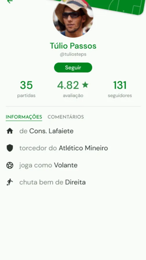 Marque sua partida, busque jogadores pelo nome ou posição, avalie jogadores e quadras.